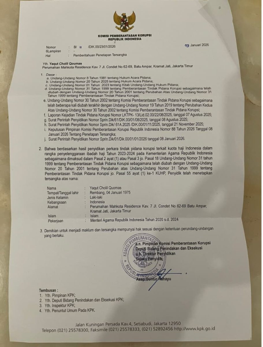 Sebuah surat resmi Komisi Pemberantasan Korupsi (KPK) yang beredar luas di publik mengungkap fakta mengejutkan. Dalam dokumen bertanggal 8 Januari 2026, KPK disebut telah menetapkan Yaqut Cholil Qoumas, Menteri Agama Republik Indonesia periode 2020–2024, sebagai tersangka dalam perkara dugaan tindak pidana korupsi terkait kuota haji Indonesia.