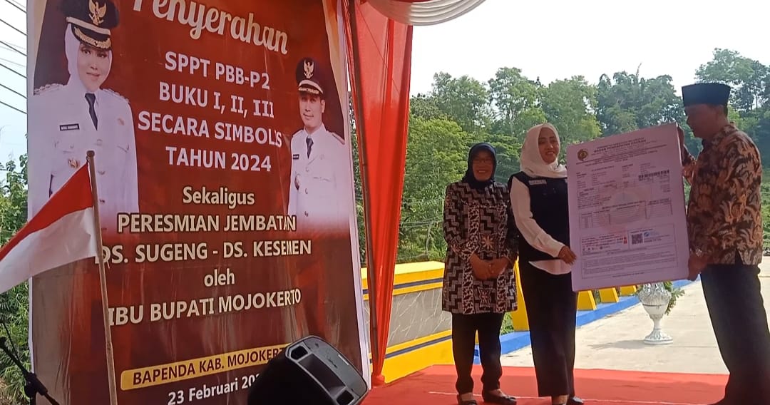 Untuk meningkatkan pendapatan Daerah melalui Pajak di tahun 2024 ini, maka Bapenda Kabupaten Mojokerto menyerahkan Surat Pemberitahuan SPPT PBB – P2, Buku I, II, III kepada Kepala Desa se Kabupaten Mojokerto yang penyerahan surat pemberitahuan SPPT PBB – P2 Buku I II III itu diserahkan secara simbolis oleh Bupati Mojokerto dr Ikfina Fahmawati didampingi kepala Bapenda Kabupaten Mojokerto Hj Mardiasih SH MH, Jum’at ( 24 / 02 / 2024 ) di Desa Sugeng Kecamatan Trawas.