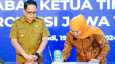 Gubernur dan Wakil Gubernur Jawa Timur masa jabatan 2019-2024 melakukan serah terima jabatan kepada Pejabat (Pj) Gubernur Jawa Timur dan…