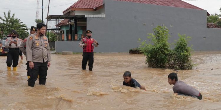 Kapolres Ponorogo AKBP Catur C. Wibowo ,S.I.K, M.H. bersama Forkopimda Kab.Ponorogo dan instansi terkait meninjau langsung lokasi terdampak banjir di wilayah Kab.Ponorogo.