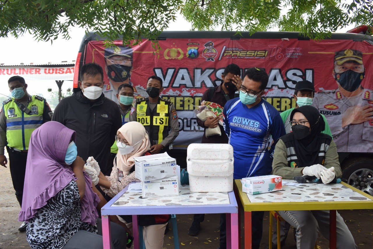 Selain itu, di lokasi Wisata Bahari Tlocor, juga ada mobil gerai vaksinasi keliling Polresta Sidoarjo guna melayani masyarakat yang belum vaksinasi pertama maupun kedua.