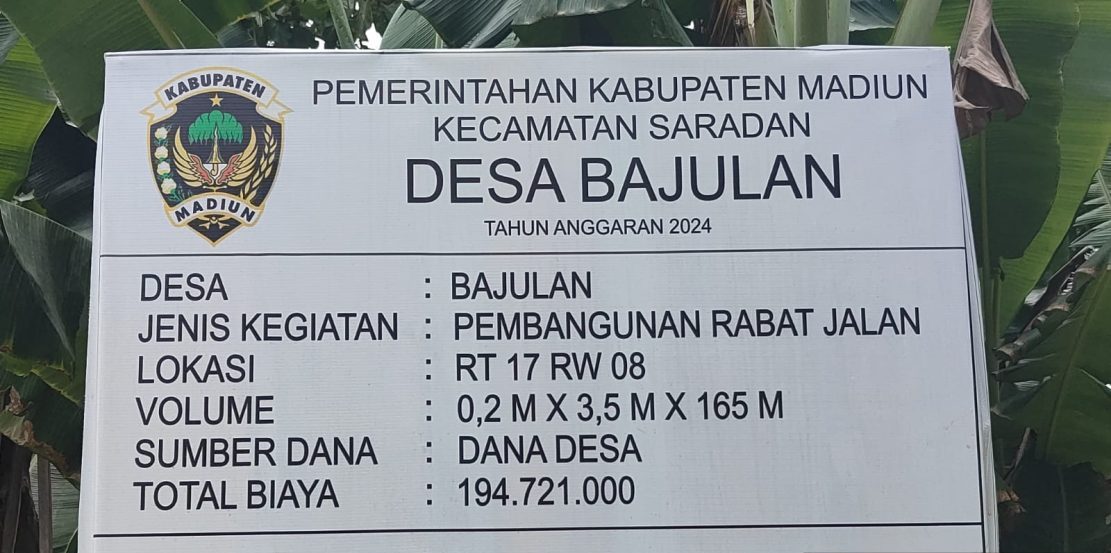 Pekerjaan rabat jalan di Desa Bajulan, Kecamatan Saradan, Kabupaten Madiun diduga tidak sesuai perencanaan. Pasalnya, volume rabat jalan yang menggunakan Dana Desa itu tidak sesuai dengan papan proyek yang terpasang.