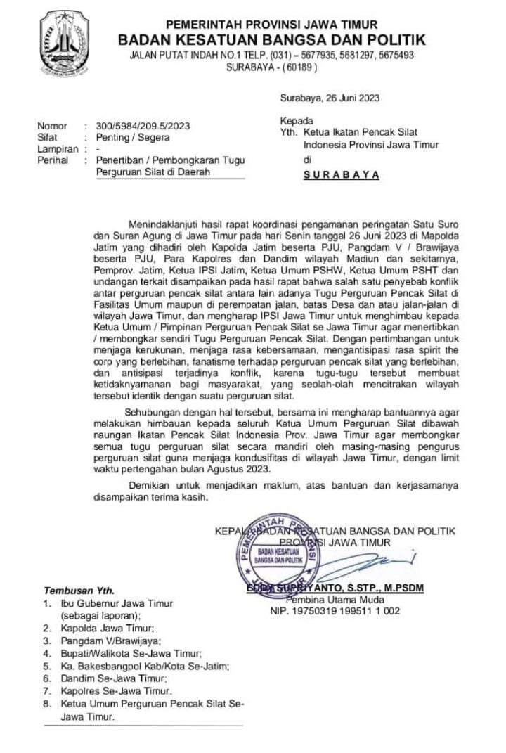 Akhir-akhir ini dunia Pencak silat tanah air terutama jawa timur kembali hangat semenjak Badan Kesatuan Bangsa dan Politik (Bakesbangpol) Provinsi Jawa Timur telah mengeluarkan surat nomor 300/5984/209.5/2023 tentang penertiban dan pembongkaran tugu perguruan pencak silat.
