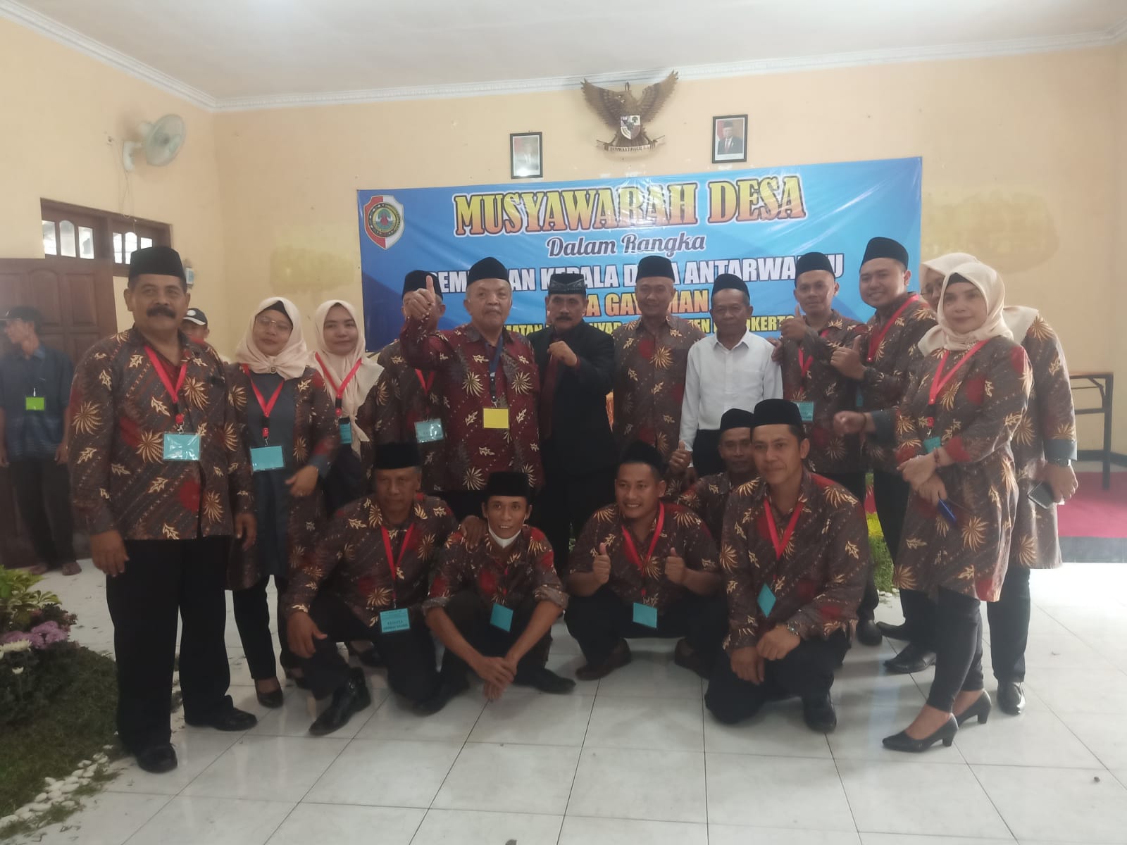 Calon Kepala Desa Gayaman terpilih Joko Wahyudi pakai Jas hitam mengepal tangannya photo bersama dengan para panitia