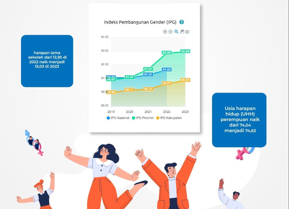 Pada tahun 2023 komponen IPG perempuan yang berada di atas laki-laki adalah usia harapan hidup dan harapan lama sekolah. Untuk usia harapan hidup (UHH) perempuan naik dari 74,04 menjadi 74,63, sedang harapan lama sekolah dari 12,95 di 2022 naik menjadi 13,03 di 2023. Sedang komponen rata-rata lama sekolah dan pengeluaran perkapita masih berada di bawah laki-laki.