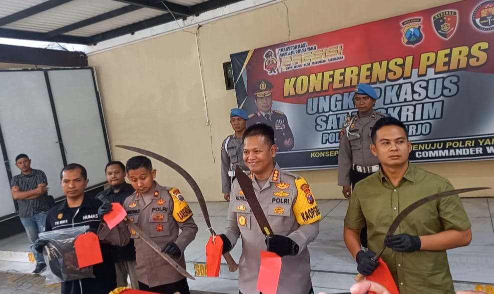“Tidak sampai sehari kasus ini terungkap, ada sepuluh pelaku sebagian besar masih bawah umur, berstatus pelajar yang kami amankan. Beserta sejumlah barang bukti senjata tajam antara lain empat clurit, satu bilah pedang, satu bilah golok, satu kepala stik golf dan satu kayu,” ujar Kapolresta Sidoarjo Komisaris Besar Polisi Kusumo Wahyu Bintoro, Rabu (24/5/2023).