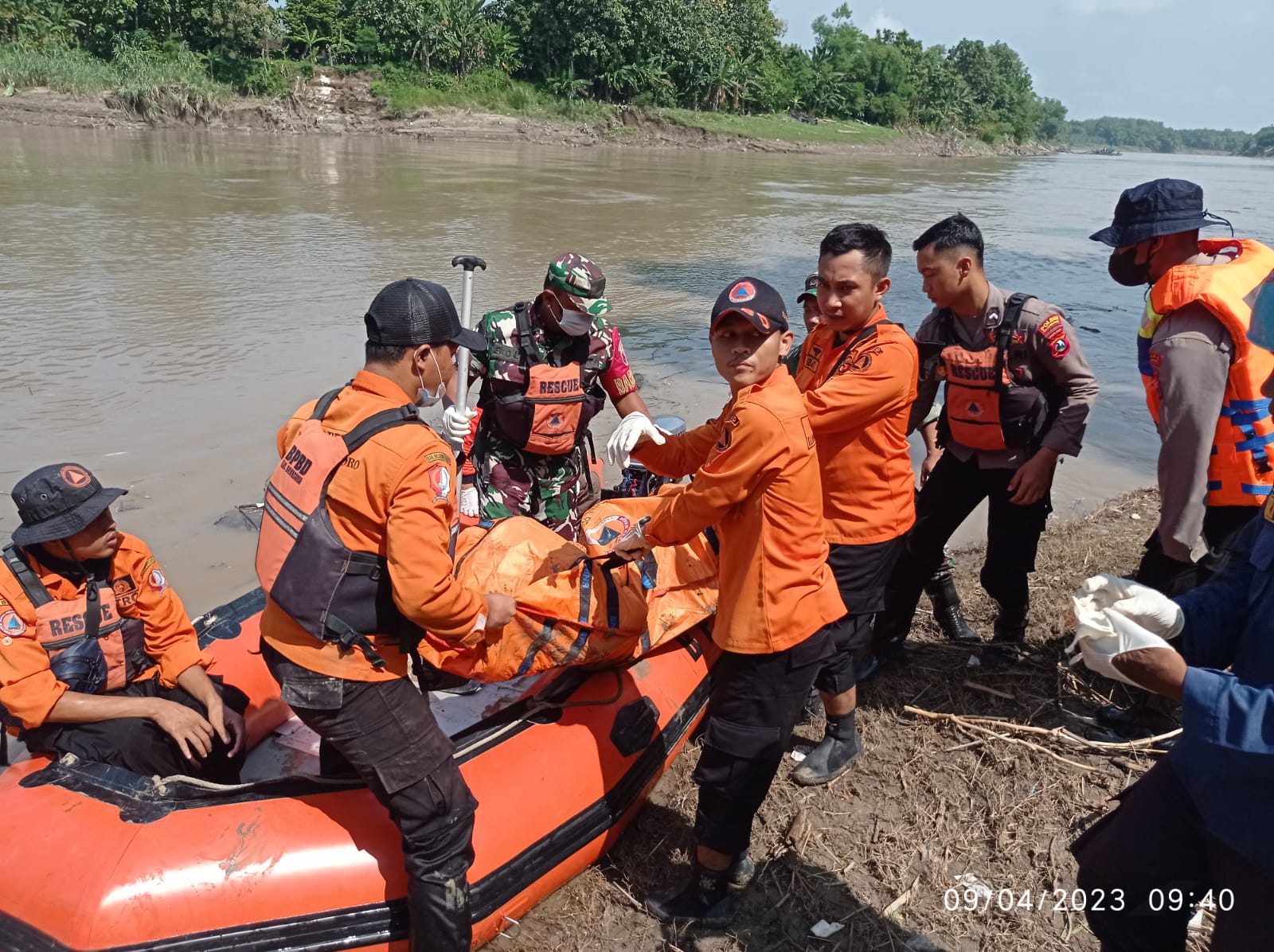 Dengan kerja sama semua tim gabungan, korban berhasil ditemukan di aliran Bengawan Solo sekitaran Desa Sumberarum Kecamatan Ngraho, dalam kondisi meninggal dunia, Minggu (9/4/2023)