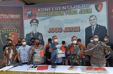Kabid Humas Polda Jatim Kombes Dirmanto- Dirreskrimum Polda JAtim Kombes Totok Suharyanto didampingi AKBP Lintar Mahardhono dan Kanit Perjudian Kompol Wahyu Hidayat, Jumat (22/7/2022) menjelaskan, kronologi, anggota Unit III Subdit III Jatanras Dittreskrimum Polda Jatim usia menerima laporan segera melakukan serangkaian giat penyelidikan berkaitan dengan pencurian dengan pemberatan berupa sepeda motor yang terjadi di wilayah Kabupaten Sidoarjo diketahui keberadaan pelaku tersebut berada di wilayah Kecamatan Puspo, Kabupaten Pasuruan atas nama Sobirin.
