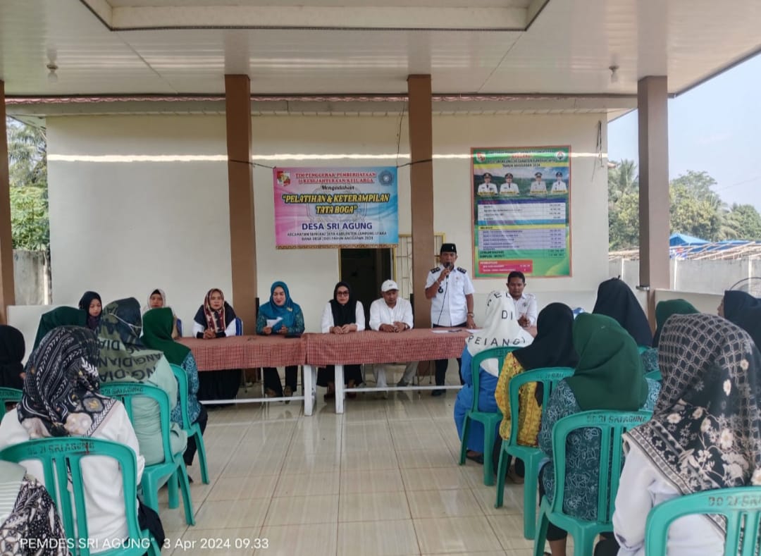 Pemerintah Desa (Pemdes) melalui Tim Penggerak Pemberdayaan dan Kesejahteraan Keluarga (TP-PKK) Sri Agung, Kecamatan Sungkai Jaya, Kabupaten Lampung Utara, Gelar pelatihan tata boga melalui program pemberdayaan desa yang bersumber dari dana desa tahun 2024.