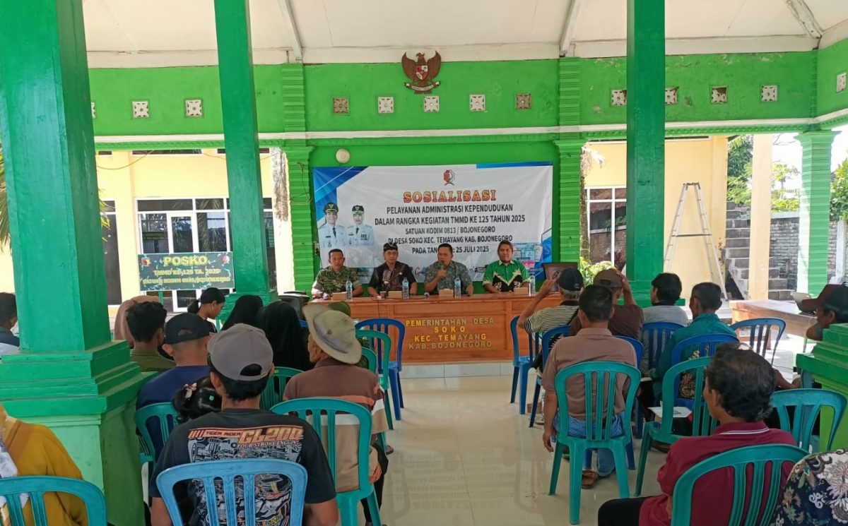 Untuk mendukung kegiatan program TNI Manunggal Membangun Desa (TMMD) ke- 125, Pemerintah Kabupaten (Pemkab) Bojonegoro melalui Dinas Kependudukan dan Pencatatan Sipil (Dispenduk Capil) menggelar Sosialisasi Administrasi Kependudukan di Balai Desa Soko Kecamatan Temayang Kabupaten Bojonegoro Jawa Timur, Jum’at (25/7/2025).