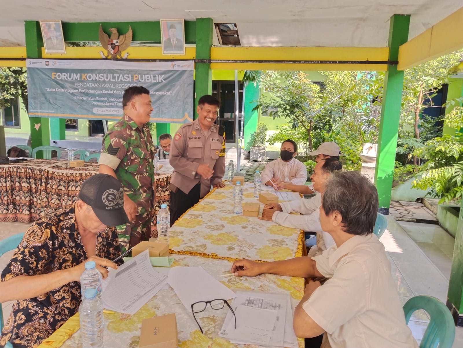 Personel TNI-Polri Kecamatan Sedati, Kabupaten Sidoarjo, bersinergi lakukan pengamanan kegiatan Forum Konsultasi Publik (FKP) hari ketiga, Sabtu (6/5/2023) bertempat di Balai Desa Pepe, Sedati.