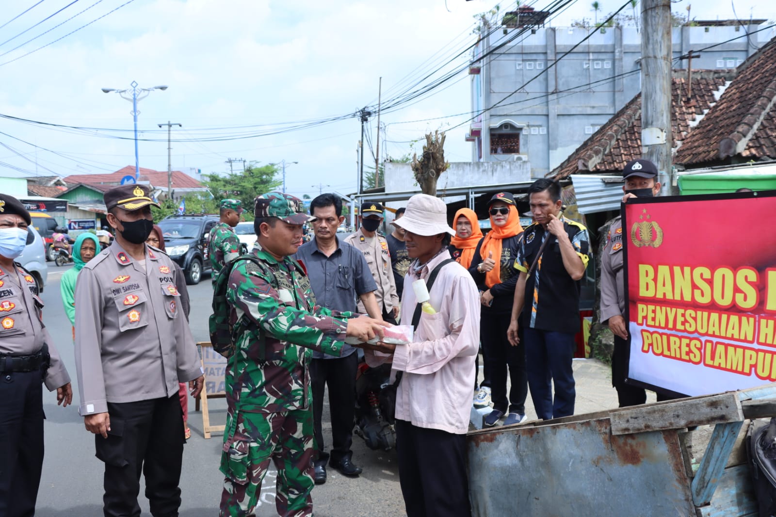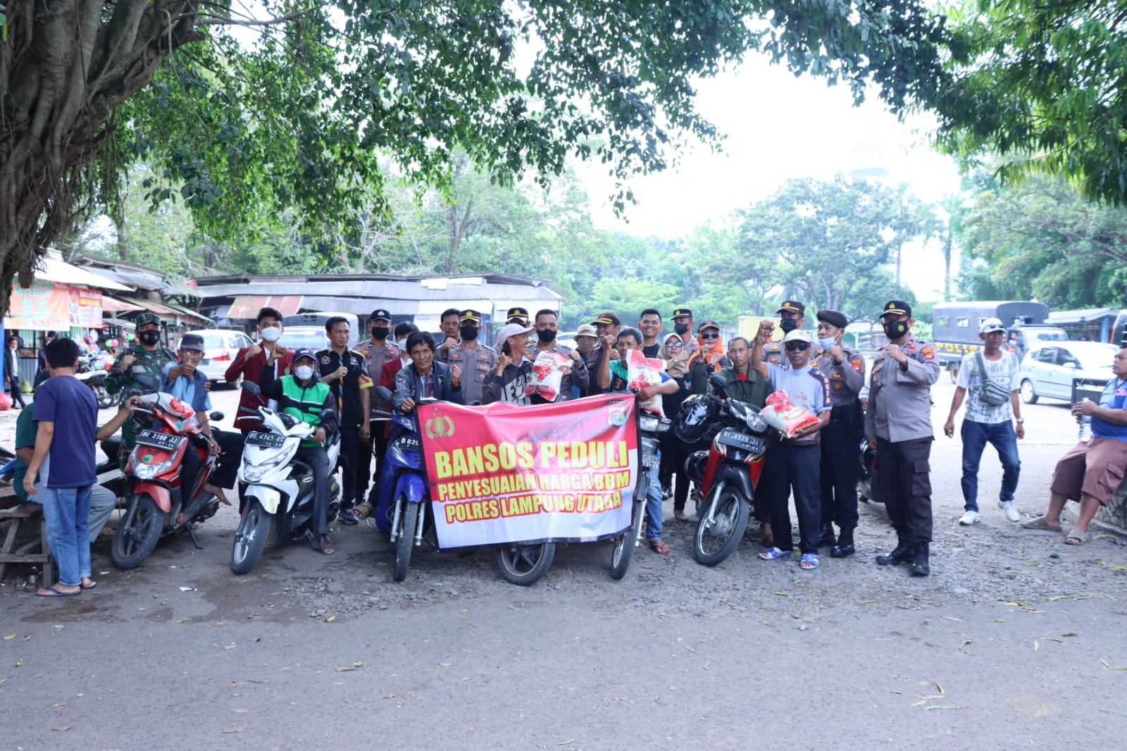 Waka Polres Lampung Utara Kompol Dwi Santosa SH., bersama-sama dengan personil TNI Kodim 0412-Lampung Utara, ormas dan Mahasiswa bagikan sembako kepada warga yang terdampak langsung dari penyesuaian kenaikan harga BBM pada Jumat, (9/9/22).