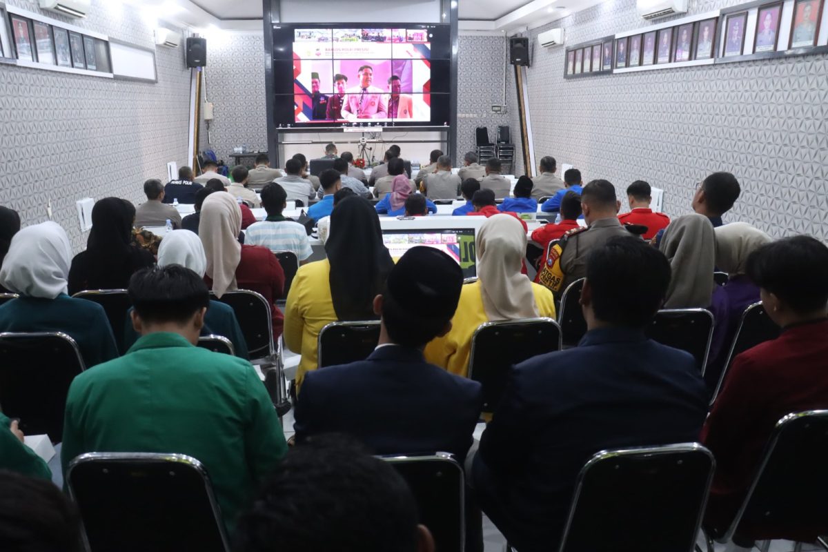 Polres Bojonegoro mengiikuti melalui sambungan zoom meeting di Gedung AP I Rawi Mapolres Bojonegoro, serta dihadiri Kapolres Bojonegoro, AKBP Mario Prahatinto, SH, SIK, M.Si, Dandim 0813/Bojonegoro, Letkol Czi Arief Rochman Hakim, SE, MM, para PJU dan mahasiswa, BEM dan OKP.