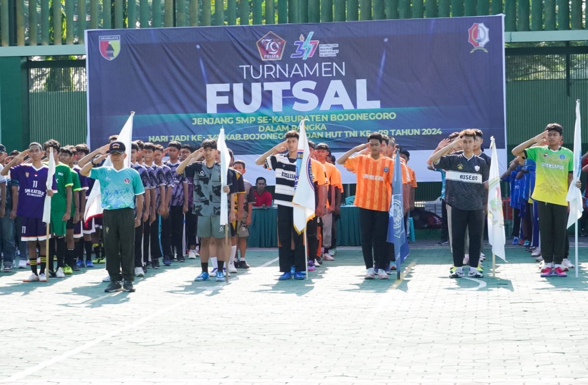 Turnamen futsal tingkat Sekolah Menengah Pertama (SMP) se- Kabupaten Bojonegoro dalam rangka memeriahkan peringatan Hari Jadi Bojonegoro (HJB) ke- 347 dan Hari Ulang Tahun (HUT) ke- 79 Tentara Nasional Indonesia (TNI) hari ini Selasa (29/10/2024) resmi dimulai.