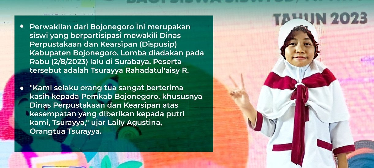 Perwakilan dari Bojonegoro ini merupakan siswi yang berpartisipasi mewakili Dinas Perpustakaan dan Kearsipan (Dispusip) Kabupaten Bojonegoro. Lomba diadakan pada Rabu (2/8/2023) lalu di Surabaya. Peserta tersebut adalah Tsurayya Rahadatul’aisy R.