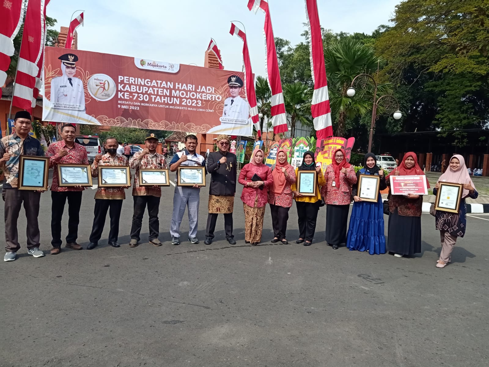 Puncak dari peringatan hari jadi Kabupaten Mojokerto ke-730 digelar dengan upacara, yang berlangsung di halaman Pemkab Mojokerto, Selasa (9/5/2023) pagi yang langsung dipimpin oleh Bupati Mojokerto dr Ikfina Fahmawati,