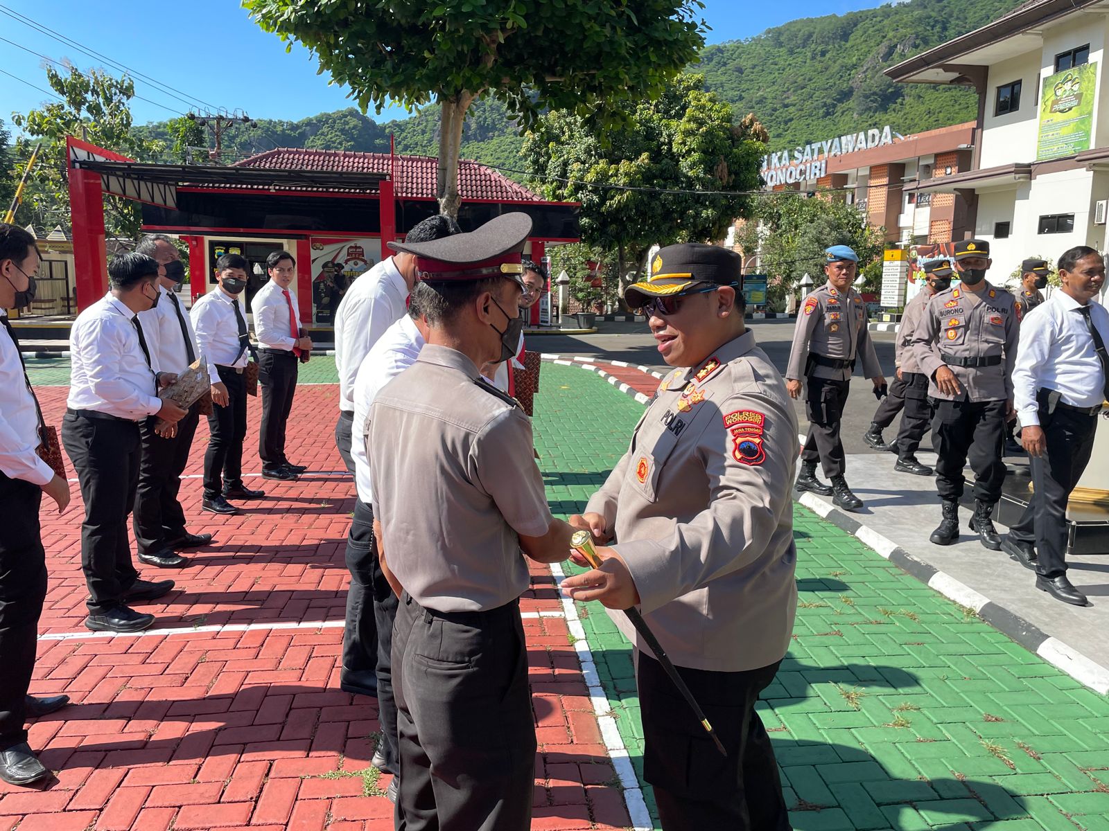 Kapolres Wonogiri, AKBP Dydit Dwi Susanto, mengucapkan selamat kepada anggota yang mendapatkan kenaikan pangkat dari aiptu ke ipda yakni Aiptu Sagino yang bertugas di Polsek Baturetno.