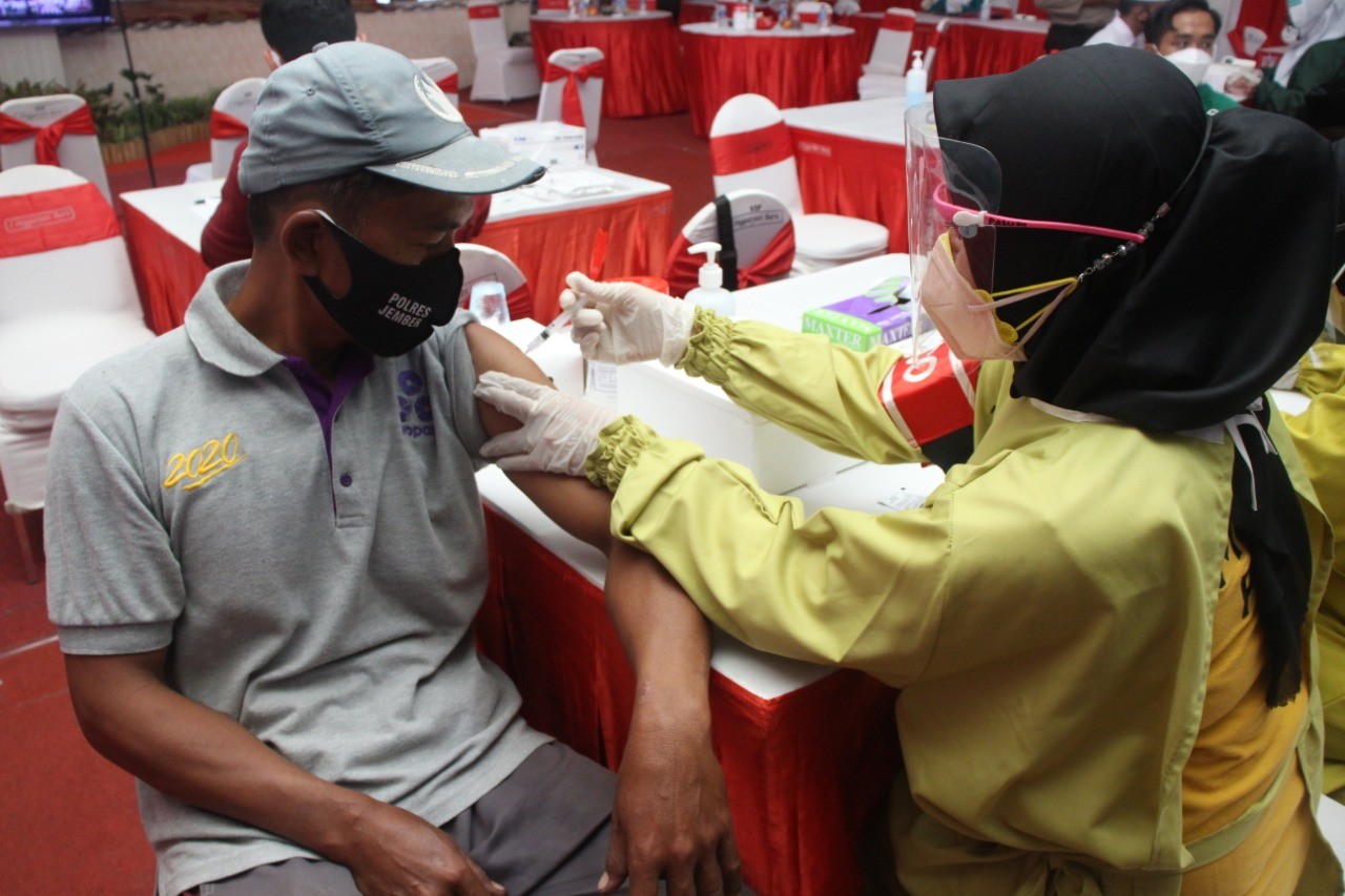 Pelaksanaan Vaksinasi Covid-19 melibatkan Tenaga Kesehatan Polres Jember, Dinkes Kabupaten Jember.
