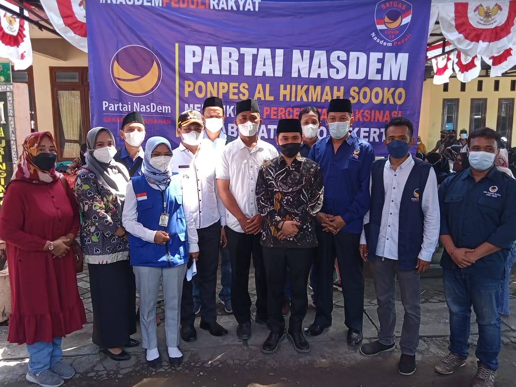 Dalam rangka untuk membantu program percepatan Vaksinasi yang digalakkan oleh pemerintah dalam menghadapi pandemi Covid-19, agar cepat berakhir, DPD Partai Nasdem Kabupaten Mojokerto, Rabu pagi (1 /9/ 2021 ) menggelar Vaksinasi di Ponpes Al- Hikmah Desa Wringinrejo Kecamatan Sooko, Kabupaten Mojokerto, yang langsung ditinjau oleh Wakil Bupati Mojokerto H.Muhammad Albarra, LC. M.Hum yang akrab disapa Gus Barra itu.