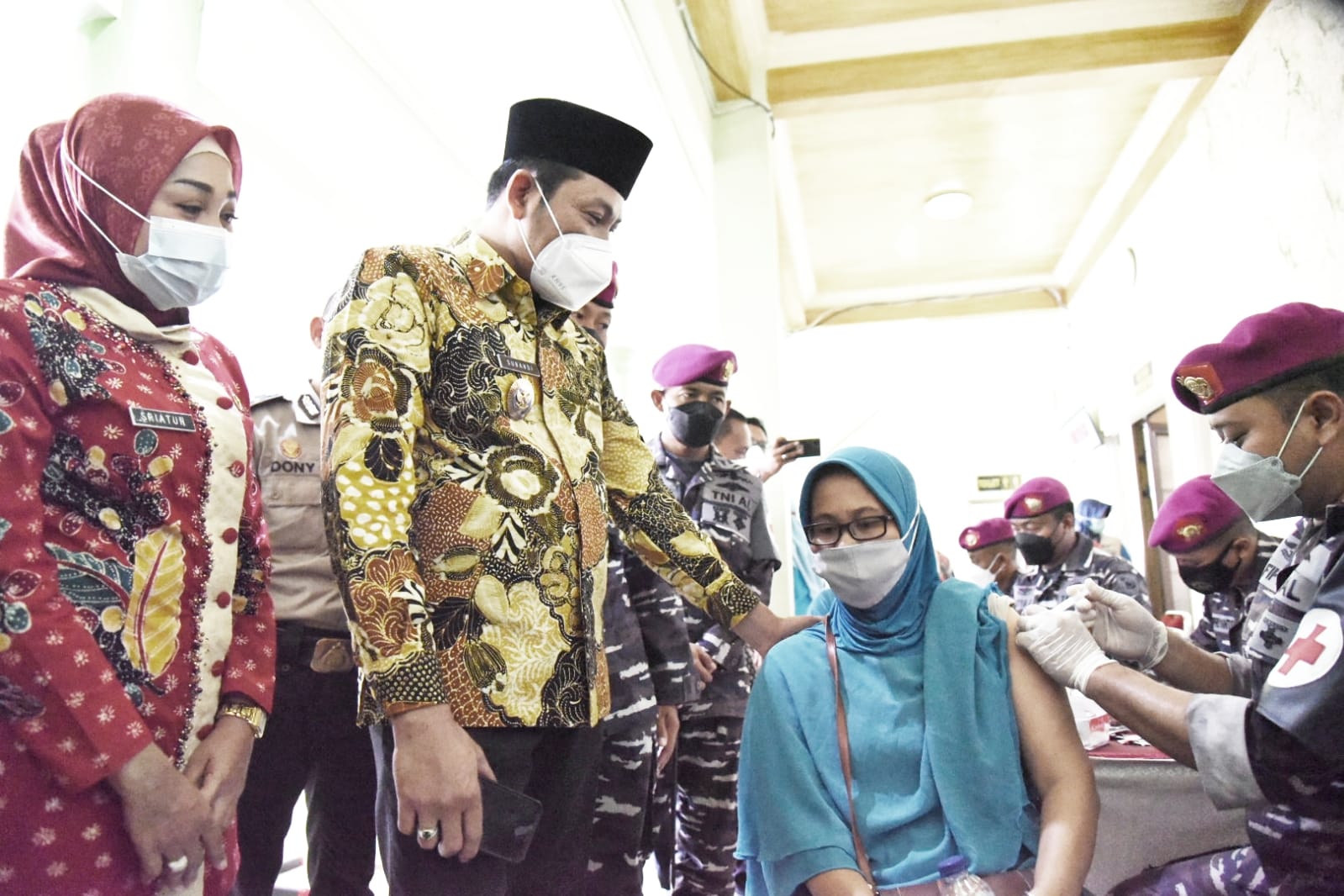 H. Subandi, S.H., Bupati Sidoarjo, bersama dengan Letkol Marinir Agus Hariyanto, M.Tr.Hanla., selaku Komandan Rayon Angkatan Motor Pasukan Marinir 2, meninjau vaksinasi yang dilakukan di Desa Pabean, Kecamatan Sedati, bersama rombongan, pada Selasa di Balai Desa Pabean (2/11).