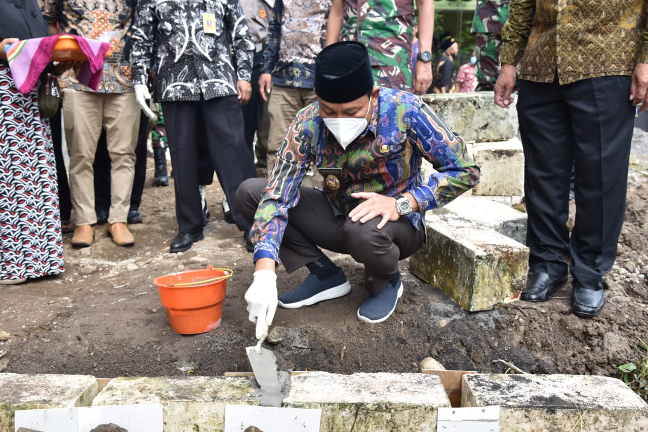 Wabup Sidoarjo Subandi meletakkan batu pertama pembangunan TPQ Darul Istiqomah, Desa Kwangsan Sedati. Kamis, (10/3/2022).