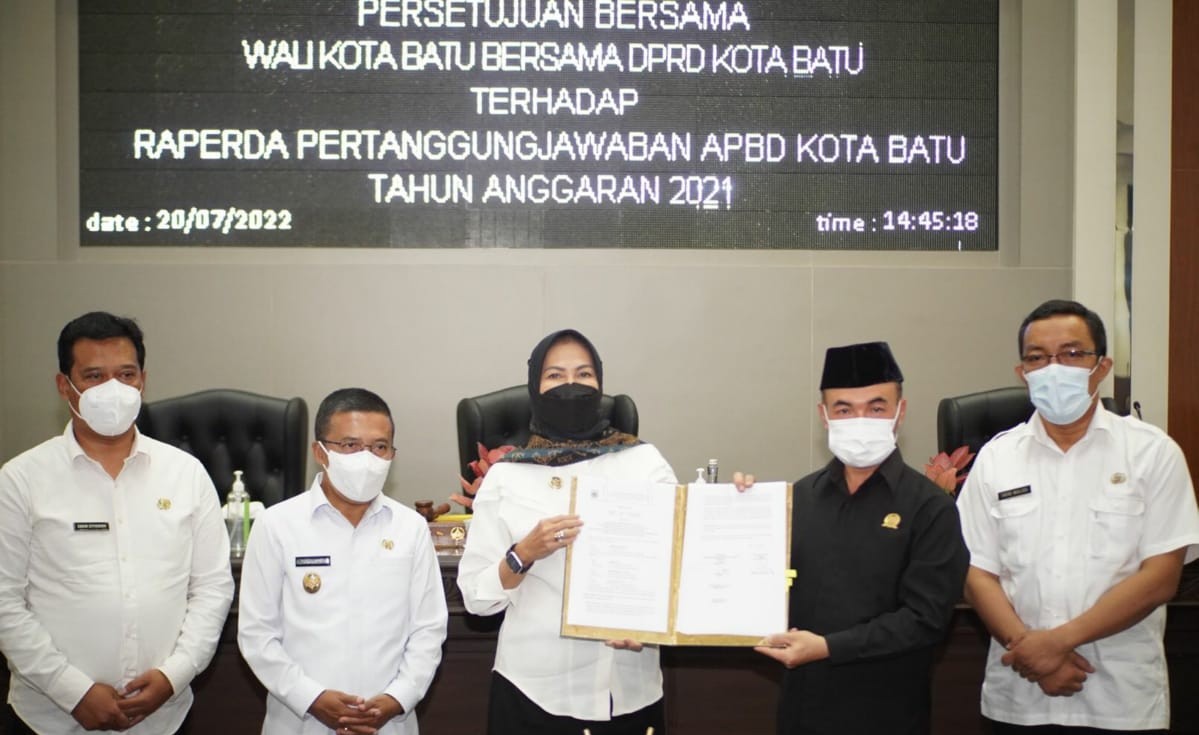 DPRD Kota Batu bersama Wali Kota Batu menandatangani persetujuan bersama Raperda Pertanggungjawaban APBD TA 2021 pada Rabu, (20/7/2022).