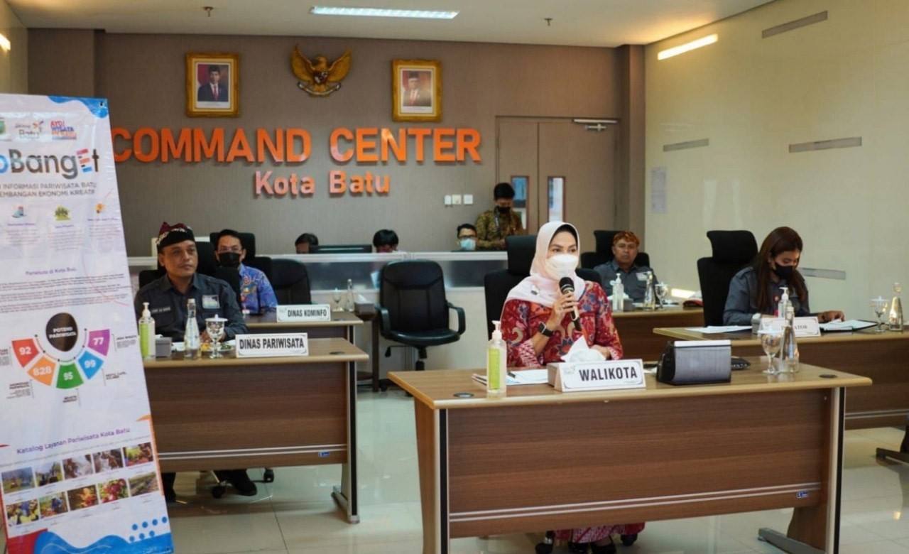 Wali Kota Batu, Hj. Dewanti Rumpoko, melakukan presentasi dan wawancara Kompetisi Inovasi Pelayanan Publik (KIPP) 2022 secara virtual di ruang Command Center Balaikota Among Tani Kota Batu, Kamis, (7/7/2022).