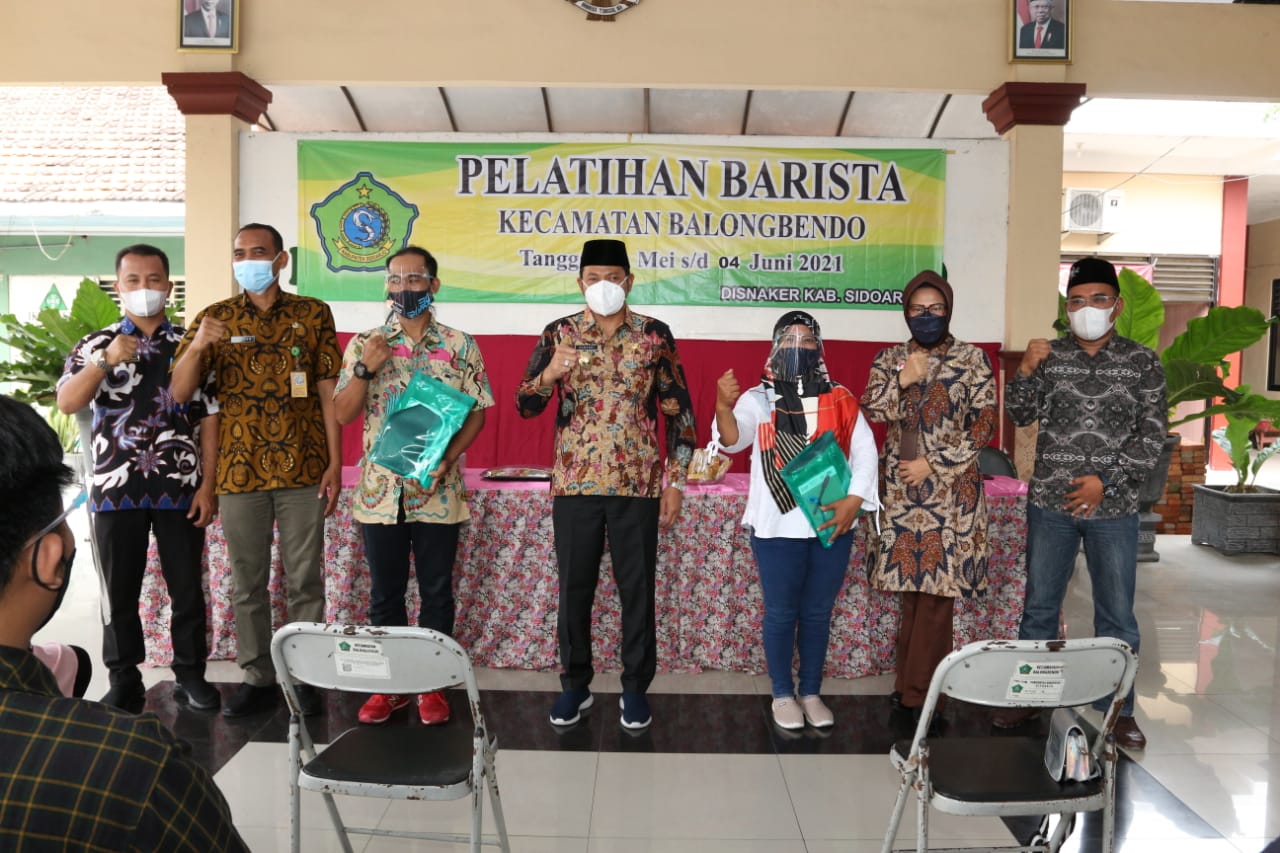Pelatihan Barista atau penyaji kopi profesional kembali digelar Pemkab Sidoarjo. Kali ini diberikan kepada 32 warga Kecamatan Balongbendo. Pelatihan digelar mulai tanggal 25 Mei sampai tanggal 4 Juni 2021 di kantor Kecamatan Balongbendo. Pagi tadi, pelatihan tersebut dibuka oleh Wakil Bupati Sidoarjo H. Subandi SH, Selasa (25/5).