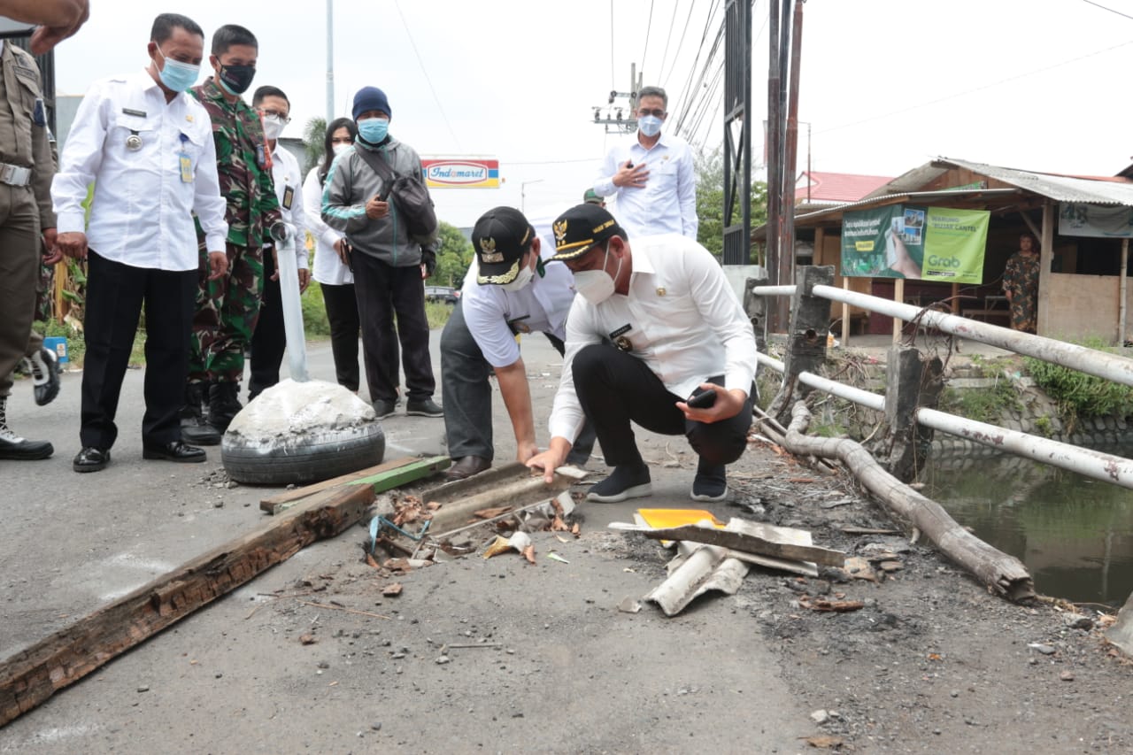 Wakil Bupati Sidoarjo Subandi mengecek Jembatan penghubung antara Desa Semampir Kecamatan Sedati dan Desa Tambak Sawah Kecamatan Waru. Jembatan yang menghubungkan dua desa itu dilaporkan rusak berlubang sehingga membahayakan pengendara yang lewat. Saat mengecek Subandi didamping Asisten Administrasi Perekonomian dan Pembangunan Benny Airlangga Yogaswara dan Plt. Kepala Dinas PU Bina Marga dan Sumber Daya Air Kabupaten Sidoarjo Sigit Setyawan. Rabu, (6/10/2021).