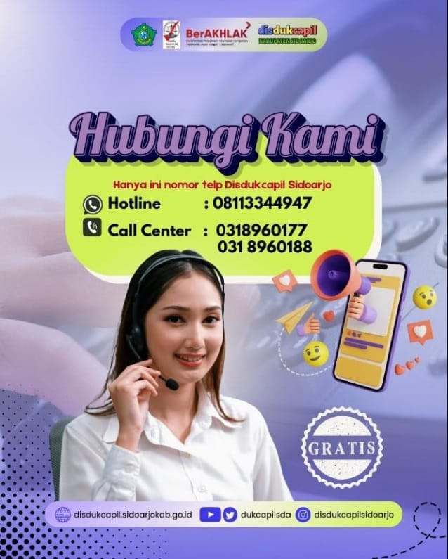 Semua pelayanan yang diberikan oleh Disdukcapil Kabupaten Sidoarjo bersifat gratis. Jika ada pihak yang menghubungi dan mengaku sebagai petugas Disdukcapil Kabupaten Sidoarjo agar segera melaporkan kepada Disdukcapil Kabupaten Sidoarjo atau pihak Desa/Kelurahan, pihak Kecamatan maupun Kepolisian setempat untuk ditindaklanjuti. (Gus)