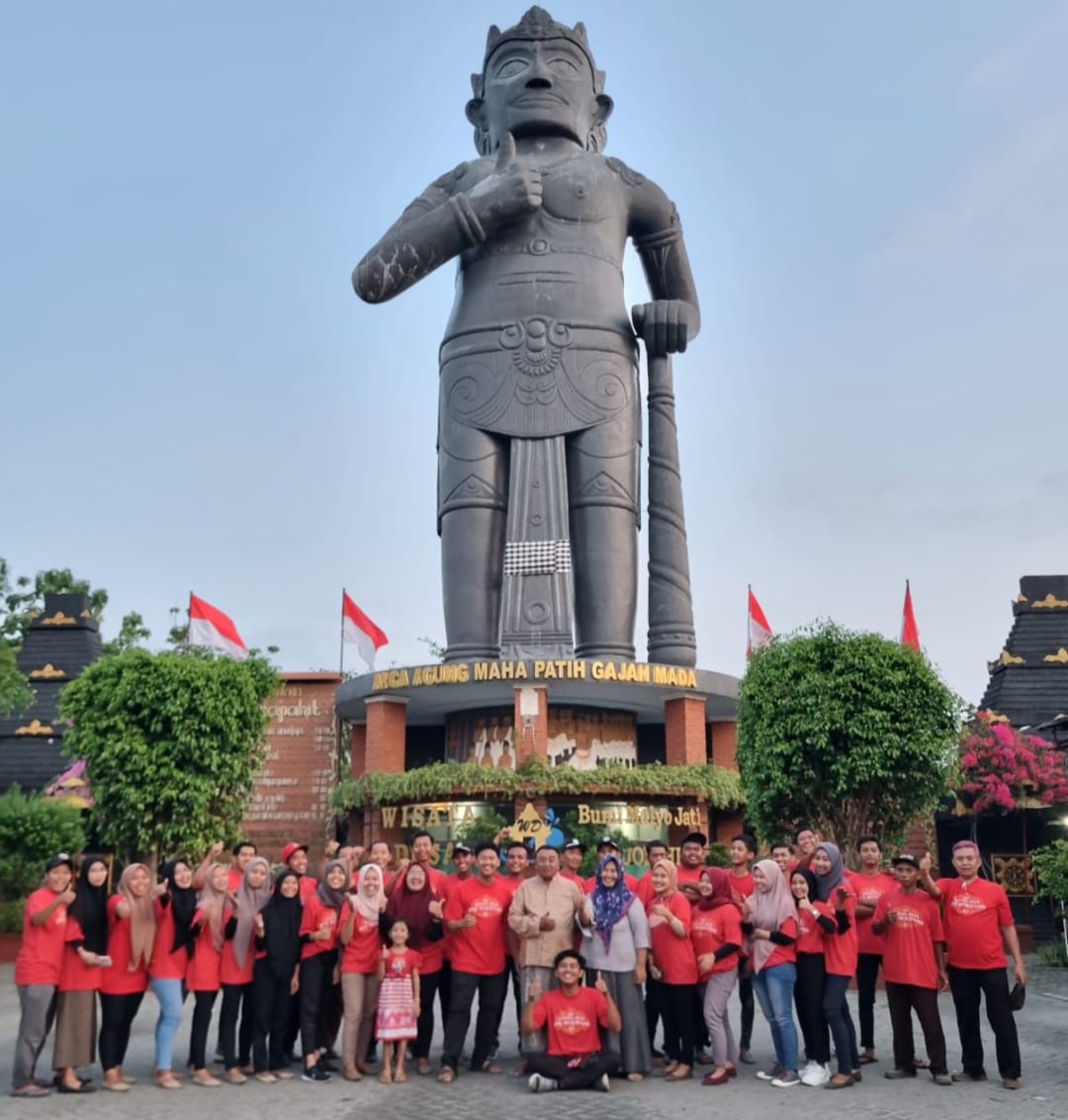 Pengelola Wisata Desa BMJ Mojopahit Mojokerto Ki Mulyono SH MM didampingi istrinya Ny. Emi Triana, SE, photo bersama Karyawannya di depan Patung Archa Agung Maha Patih Gajah Mada