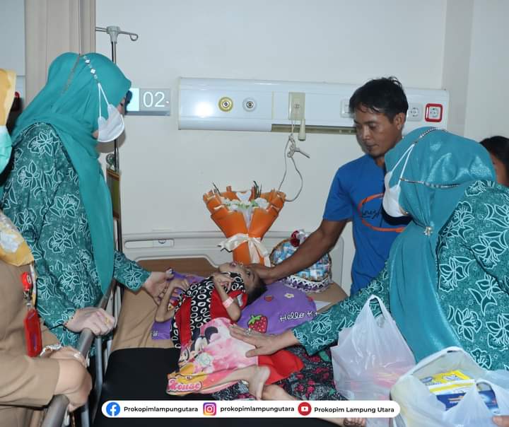 Ketua TP-PKK Kab. Kabupaten Lampung Utara Hj. Nur Endah Sulastri, S.Pd.,M.M. bersama Wakil Ketua TP-PKK Kab. Lampung Utara Devriyana Marda, S. kom menyerahkan Tali asih kepada Salleha dan Muhamad Samudra Penderita Lumpuh Layu di Rs. Handayani Kotabumi. Senin (20 Februari 2023).