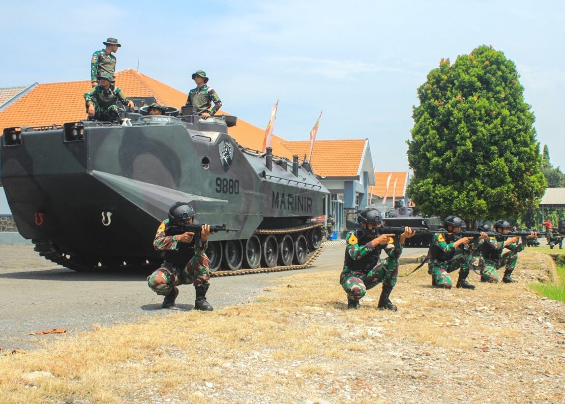 Prajurit Fighter Sejati Batalyon Kendaraan Pendarat Amfibi 2 Marinir (Yonranratfib 2 Mar) mempresentasikan diri sebagai satuan tempur pada kegiatan Latihan Praktek (Lattek) Karkata Yudha Taruna AAL TK III Korps Marinir Angkatan ke-70 TA 2024 dengan melibatkan beberapa kendaraan tempur (Ranpur) di Garase Ranpur, Kesatrian Marinir Soepraptono, Ujung, Surabaya. Senin (22/4/2024).